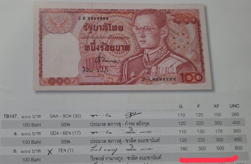 ราคาประเมิน หมวด 7E ลายเซ็น วีรพงษ์ รามางกูร - ชวลิต ธนะชานันท์ สภาพ UNC ฉบับละ 800 บาท ข้อมูลจาก จากหนังสือ"คู่มือธนบัตรไทย" โดย อ.สมชาย แสงเงิน
