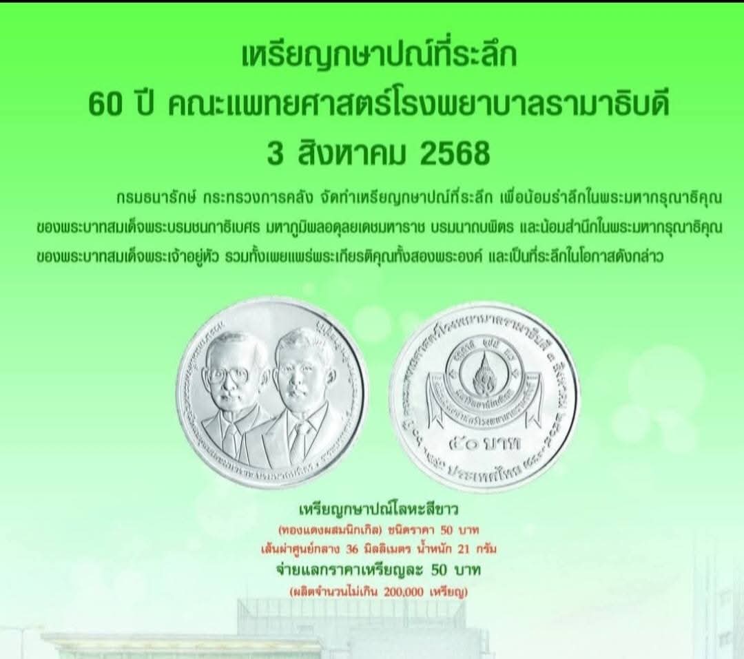 เหรียญกษาปณ์ที่ระลึก 60 ปี คณะแพทยศาสตร์ โรงพยาบาล รามาธิบดี มหาวิทยาลัยมหิดล 3 สิงหาคม 2568 ชนิดราคา 50 บาท จำนวน 10 เหรียญ เหรียญสภาพไม่ผ่านการใช้งาน UNC พร้อมกระปุกเดิมจากกรมธนารักษ์ ครับ ผลิต 200,