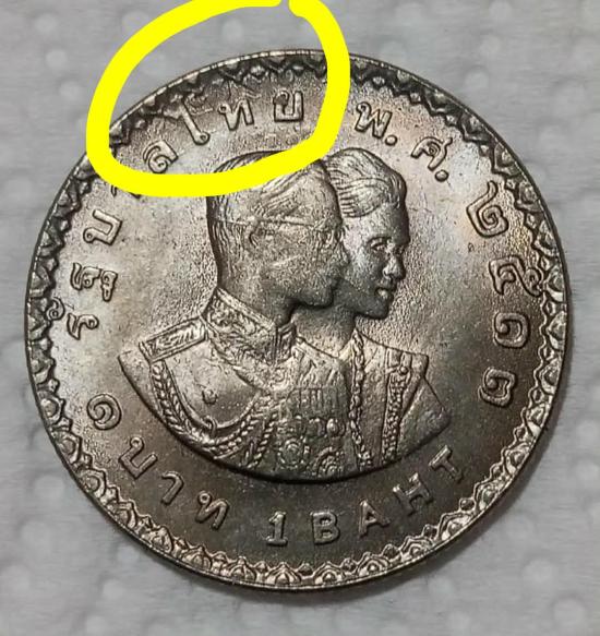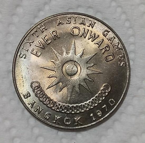 เหรียญ 1 บาท เอเชี่ยนเกมส์ ครั้งที่ 6 ในหลวงคู่ราชินี พ.ศ.2513 ในสมัยรัชกาลที่ 9 สภาพไม่ผ่านใช้แกะแบ่งจากถุง จำนวน 1 เหรียญ ครับ ((ปี้มพลาดตามรูปครับที่วงสีเหลืองไว้ครับ พบเจอน้อยครับ))