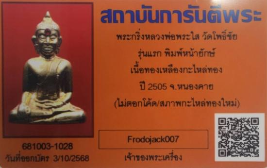 พระกริ่งหลวงพ่อพระใส วัดโพธิ์ชัยรุ่นแรก พิมพ์หน้ายักษ์เนื้อทองเหลืองกะไหล่ทอง ปี 2505 จังหวัดหนองคาย พร้อมบัตรรับรองจากการันตีพระ