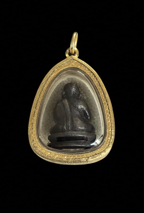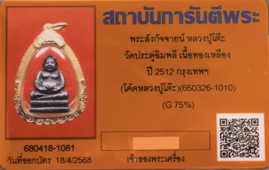 องค์นี้มาพร้อมเลี่ยมทองเปอร์เซ็นต์สูงหนาๆ (ค่าทำทองวันนี้ไม่น่าต่ำกว่า 25,000 บาทครับ) + บัตรรับรอง 2 สมาคม (G-Pra และ ต้นท่าพระจันทร์). บัตรของ G-Pra ระบุว่าเป็นเนื้อทองเหลืองและสร้างในปี 2512 แต่ที่แท้จริงแล้วน่าจะเป็นเนื้อนวโลหะและสร้างในปี 2517 ครับ (เหมือนในข้อมูลของบัตรต้นท่าพระจันทร์) - ที่แน่นอนคือสบายใจได้ครับว่าพระแท้. อ่านรายละเอียดพระรุ่นนี้เพิ่มเติมได้จากเพจคุณเอ็มหัดเทพครับ.