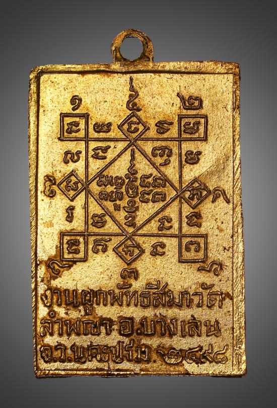 ลักษณะ: เหรียญทรงสี่เหลี่ยม ด้านหลังระบุข้อความ "งานผูกพัทธสีมาวัด ลำพญา อ.บางเลน จ.ว.นครปฐม ๒๔๙๘" พร้อมด้วยยันต์อักขระขอม