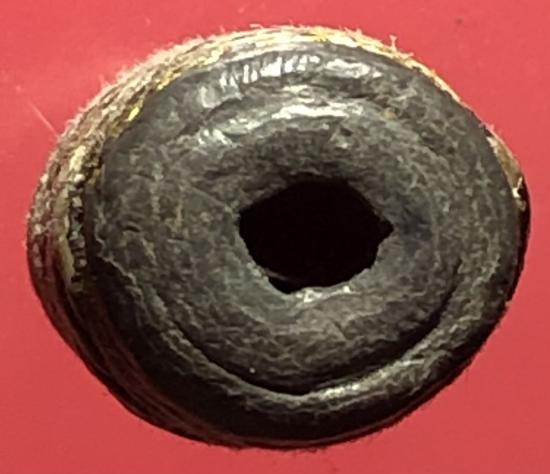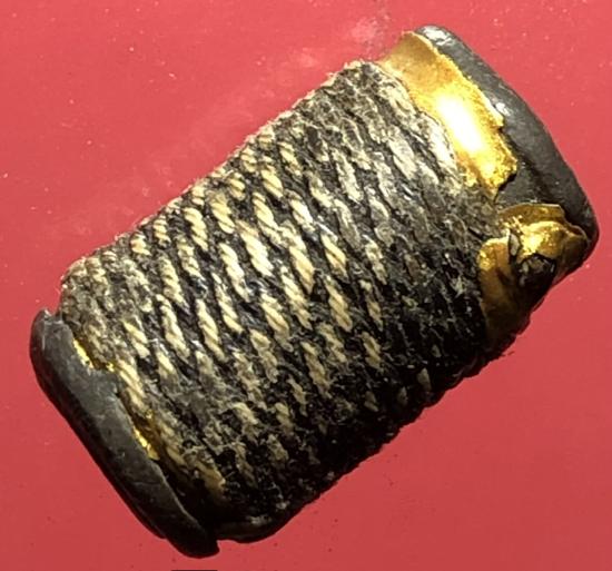 ตะกรุดนิ้วเนื้อตะกั่วเก่าถักเชือกลงรักเก่าไม่ทราบที่ ขนาดความยาว 1.0 นิ้ว |