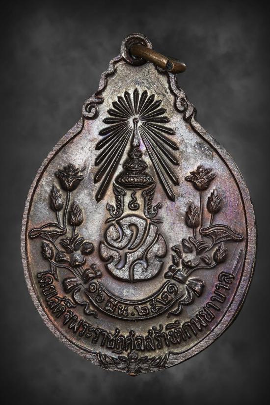 ด้านหลัง พระปรมาภิไธยย่อ ภปร. พระจุลมงกุฎเปล่งรัศมีอยู่เบื้องบน โดยเสด็จพระราชกุศลสร้างตึกพยาบาล ๑๖ มีนาคม ๒๕๒๑