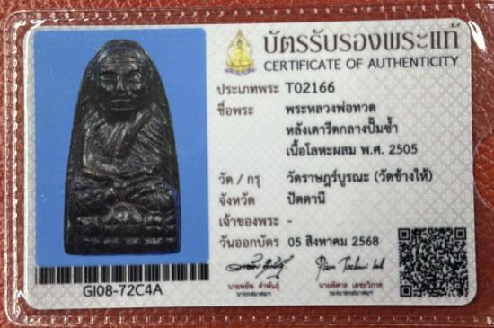 พระหลวงพ่อทวด วัดช้างให้ หลังเตารีด พิมพ์กลางปั๊มซ้ำ ปี 2505 สภาพสวยแชมป์ สวยสมบูรณ์มากๆ เส้นหน้าผาก หน้าตาติดคมชัดลึก จมูกโด่ง ผิวเดิมๆ คราบดินเบ้าเดิมๆตามซอกบัว หน้าแข้ง ริ้วจีวร ครบสูตร มีร่องรอยการปั๊มซ้ำ รอยปั๊มกระแทกรอยแยกชัดเจน ทำให้เห็นครีบเนื้อยื่นออกมา เนื้อแดงกลับดำหายากสุดๆ ผิวโลหะตึงๆเส้นปั๊มเห็นได้ชัดเจนพระมีมิติที่สมบูรณ์ แท้ดูง่าย จบทุกสายตา แท้ทุกสถาบัน เป็นเตารีดกลาง ที่ได้รับความนิยมสูงสุด ของพระหลวงพ่อทวด มาพร้อมบัตรสมาคมผู้นิยมพระเครื่องพระบูชาไทย 1 ใบ
