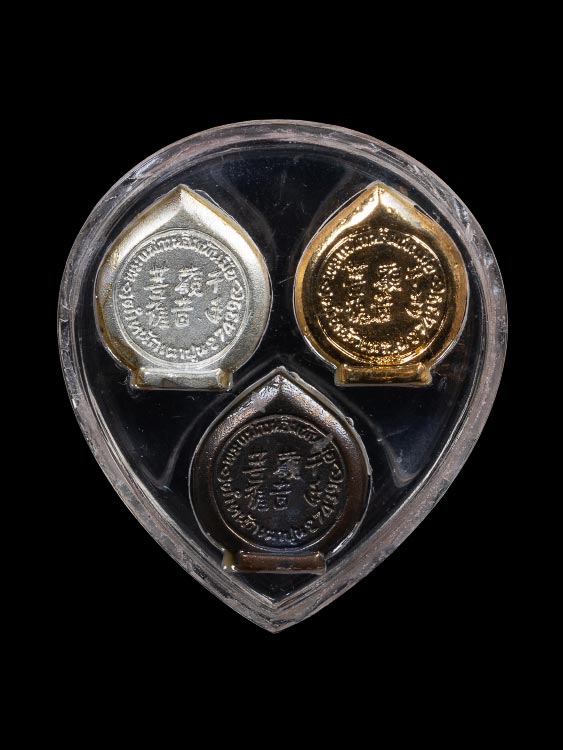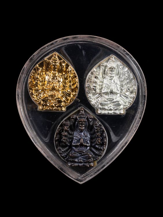 พระโพธิสัตว์อวโลกิเตศวร เจ้าแม่กวนอิม ปางพันมือ สำนักเตาปูน ชลบุรี ครบชุด 3 เนื้อ กะไหล่ทอง กะไหล่เงิน รมดำ