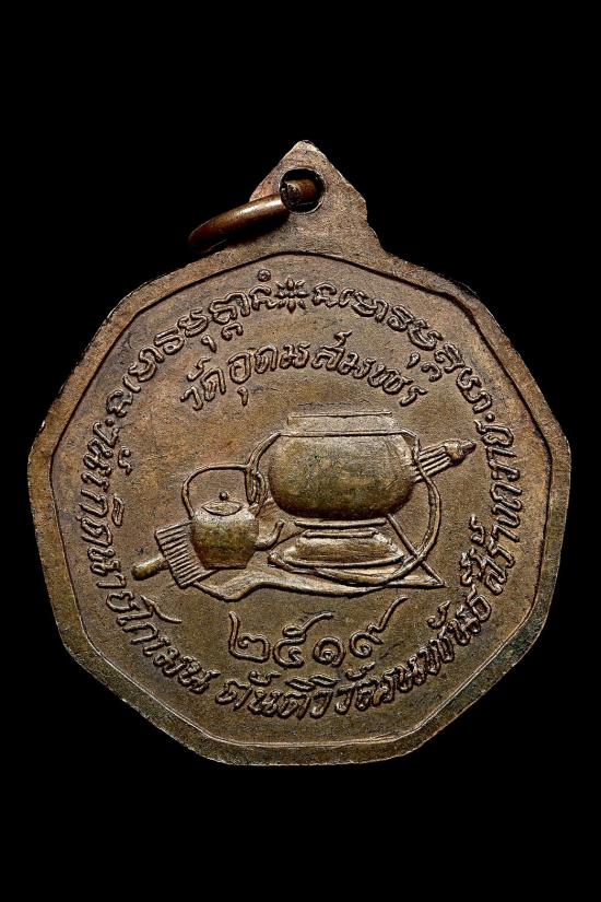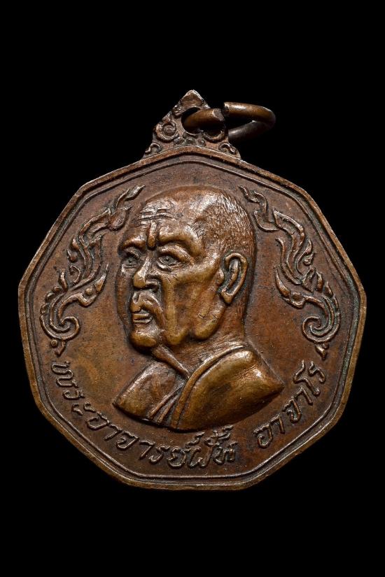 สร้างถวายโดยคุณโกเมน ตันติวิวัฒนพันธ์ และให้พระอาจารย์ฝั้นเมตตาปลุกเสกให้ เสร็จแล้วได้แจกจ่ายแก่ญาติสนิทมิตรสหายไปทั่วประเทศ สำหรับองค์นี้เป็นเลขมงคล เก้าหน้า เก้าหลัง หรือถ้ารวมกันเท่ากับ 18 เลขหนึ่งหมายถึงความเป็นผู้นำ เลขแปดหมายถึงความมั่งคงหรือไม่มีที่สิ้นสุด หรือร่ำรวยไม่มีที่สิ้นสุด เป็นเหรียญที่มีลายกนกด้านหน้าสวยงามอ้อนช้อยแบบไทยๆ ส่วนด้านหลังก็มียันต์ประจำตัวหลวงปู่ คือยันต์พญานกยูงทองพร้อมอัฐบริขารสมบูรณ์แบบตามฉบับพระสายวัดป่าหรือกรรมฐาน ควรค่าแก่การสะสมและบูชา