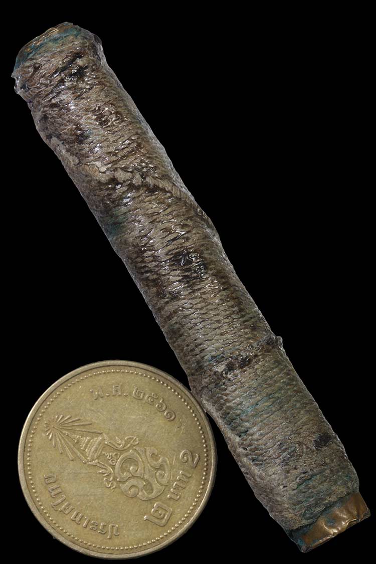 วัดใจ**เครื่องราง ตะกรุดถักเชือก เนื้อทองแดงเก่า ยาว 2.5 นิ้ว ไม่ทราบที่...ตามสภาพครับ
