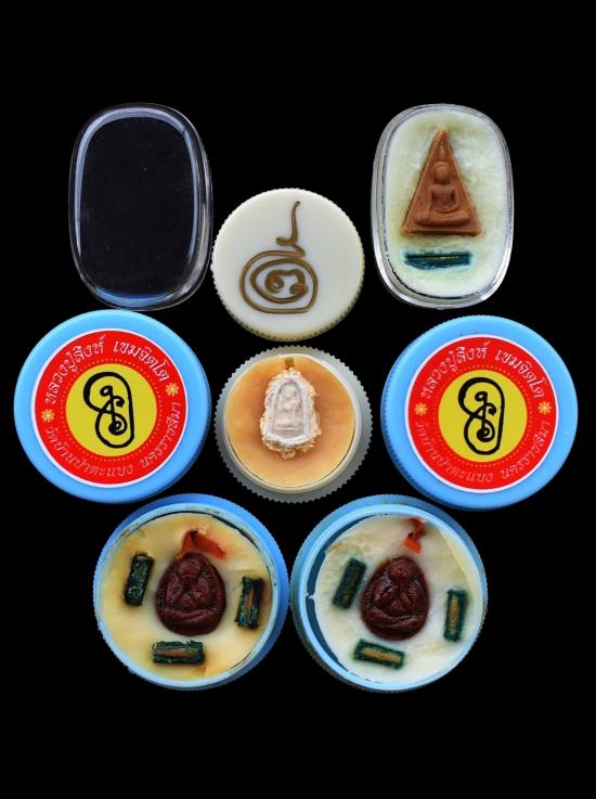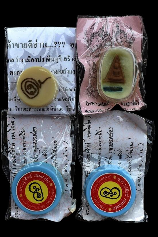ชุด 4 ตลับ...สีผึ้งแม่กวักลูกรวย หลวงพ่อผิน วัดโคกสว่าง + สีผึ้งนางพญา หลวงพ่อขันตี วัดหลวงบดินทร์เดชา + สีผึ้งจันทร์เพ็ญ หลวงปู่สิงห์ วัดบ้านป่าตะแบง พร้อมซองเดิมจากวัด สภาพพระตามรูปที่ลงทุกประการ