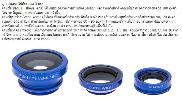 ประกอบด้วย ตัวเลนส์ 3 ชิ้น คลิปหนีบและฝาปิดเลนส์ พร้อมถุงผ้า ภายในกล่อง