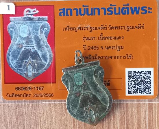เคาะเดียวแดง+++เหรียญพระปฐมเจดีย์ วัดพระปฐมเจดีย์ รุ่นแรก เนื้อทองแดง ปี2465 จ.นครปฐม พร้อมบัตรรับรองพระแท้ระบุมีคราบจากการเก็บ