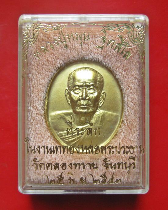 เหรียญหลวงปู่หมุน ฐิตสีโล วัดบ้านจาน เนื้อทองแดงกะไหล่ทอง ที่ระลึกในงานเททองหล่อพระประประทาน วัดคลองทราย ปี 2543 พร้อมกล่องเดิม