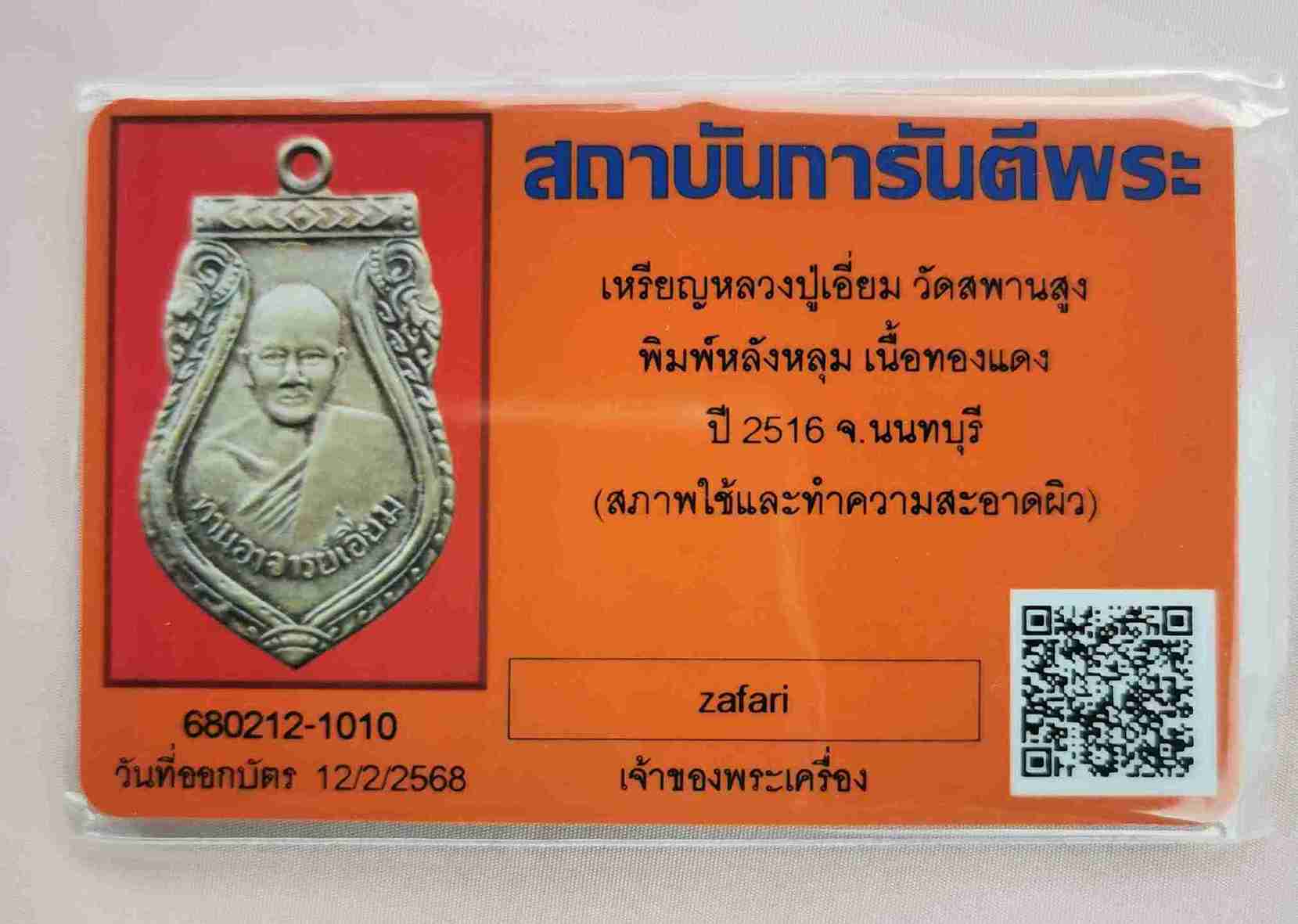 เหรียญหลวงปู่เอี่ยม วัดสะพานสูง พิมพ์ หลังหลุม ปี 2516 พร้อมบัตรรับรอง