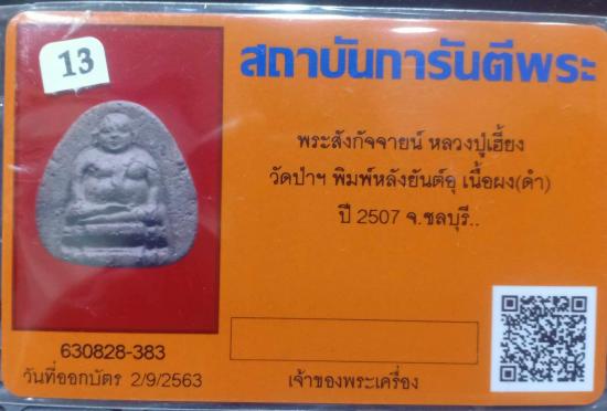 พระสังกัจจายน์หลวงปู่เฮี้ยง วัดป่าฯ จ.ชลบุรี พิมพ์ใหญ่หลังยันต์อุ เนื้อผงดำ ปี2507 พร้อมบัตรรับรองการันตรีพระครับ