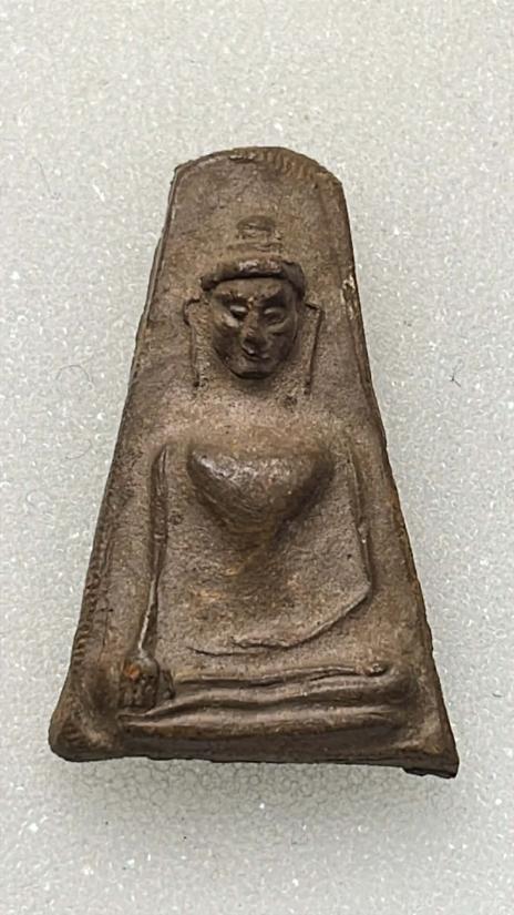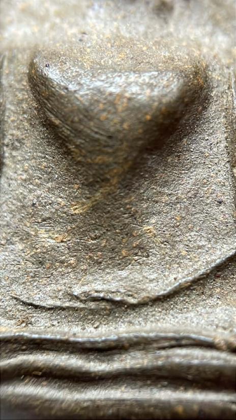 ลักษณะและเนื้อพระ: เป็นพระเนื้อดินแร่ มีความแกร่ง สีน้ำตาลเทา พิมพ์คมชัด
