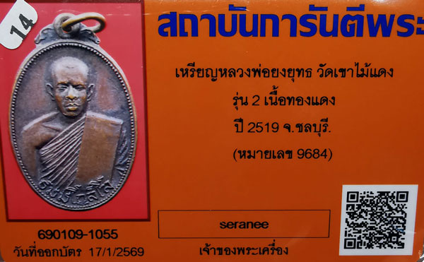 เหรียญหลวงพ่อยงยุทธ วัดเขาไม้แดง รุ่น2 เนื้อทองแดง ห่วงเดิม ปี2519 จ.ชลบุรี(หมายเลข9684) + บัตรG-pra สภาพเดิมค่ะ สภาพตามรูปทุกประการค่ะ
