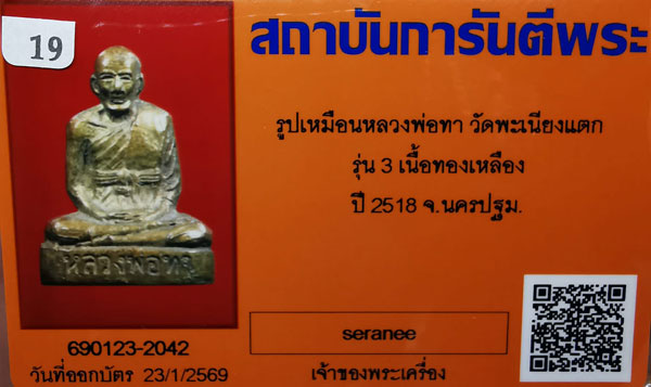รูปเหมือนหลวงพ่อทา วัดพะเนียงแตก รุ่น3 เนื้อทองเหลือง ปี2518 นครปฐม + บัตรG-pra สภาพเดิมค่ะ สภาพตามรูปทุกประการค่ะ