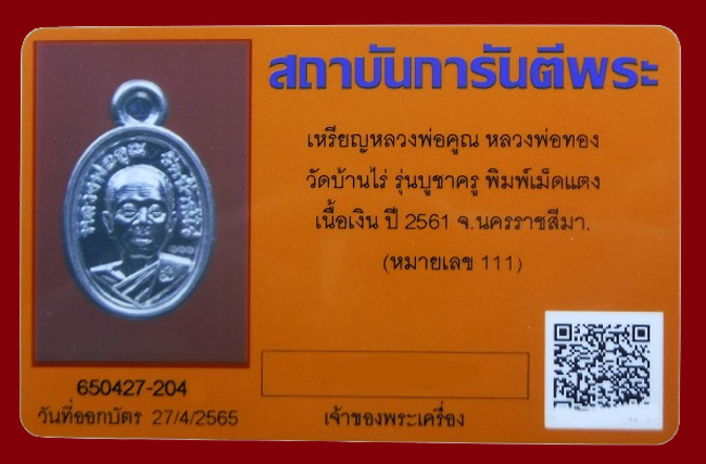 แดงที่เคาะแรก !!! เหรียญเม็ดแตง เนื้อเงิน รุ่นบูชาครู หลวงพ่อทอง วัดบ้านไร่ (ตอกโค๊ต+เลขสวย 111)+ บัตรพระแท้