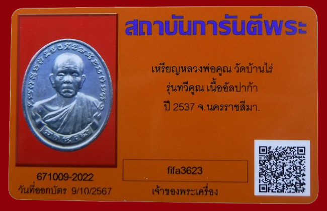 แดงที่เคาะแรก !!! เหรียญหลวงพ่อคูณ วัดบ้านไร่ รุ่นทวีคูณ เนื้ออัลปาก้า ปี2537+ บัตรพระแท้