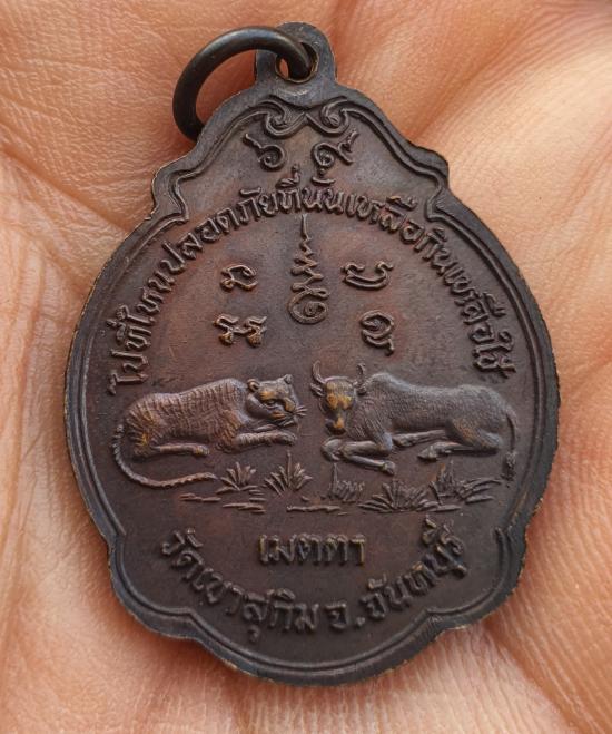 วัดใจเหรียญเมตตา เสือ-วัว หลวงพ่อสมชาย วัดเขาสุกิม จังหวัดจันทบุรี ฉลองอายุ 69 ปี ปี 2540 ทองแดง |