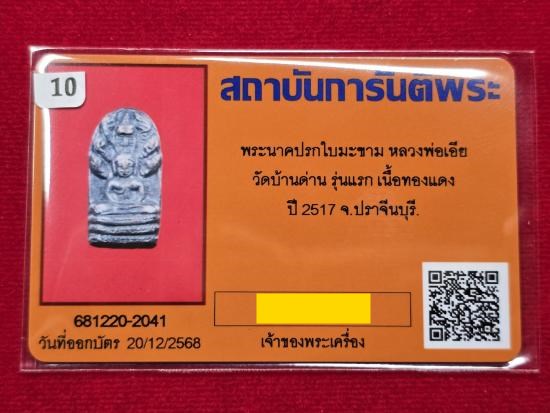 พระนาคปรกใบมะขาม หลวงพ่อเอีย วัดบ้านด่าน รุ่นแรก เนื้อทองแดง ปี 2517 พร้อมบัตรรับรอง.