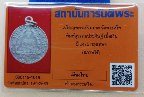 เหรียญพระแก้วมรกตปี 2475 เนื้อเงิน บล็อคนิยมสุวรรณประดิษฐ์ พร้อมบัตรสภาพใช้