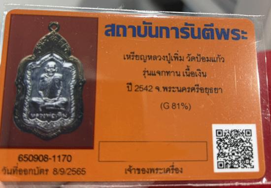 เหรียญหลวงปู่เพิ่ม วัดป้อมแก้ว รุ่นแจกทาน เนื้อเงินปี 2542 จังหวัดอยุธยา เลี่ยมทองพร้อมบัตรสวยมาก |