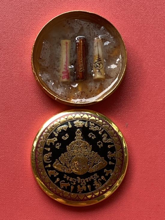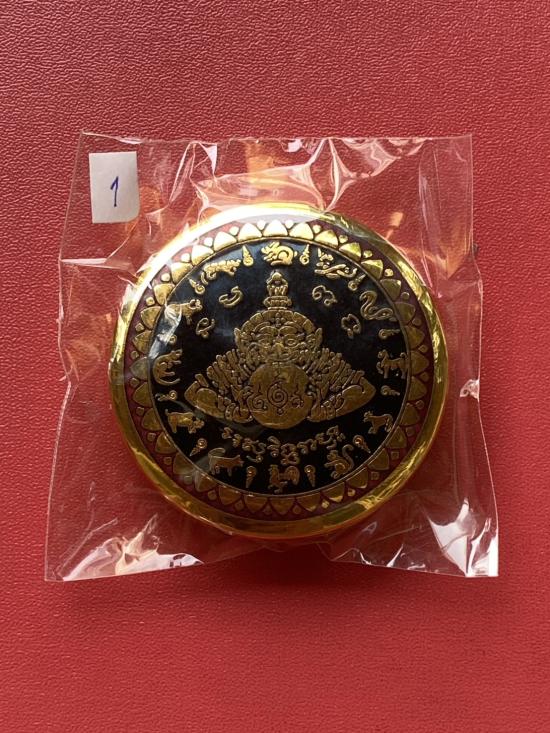 เคาะเดียวแดง สีผึ้งพระราหู รุ่น มงคลจักรวาล เนื้อ โลหะชุบทองลงยาสีดำขอบสีแดง ขนาด 5ซม |