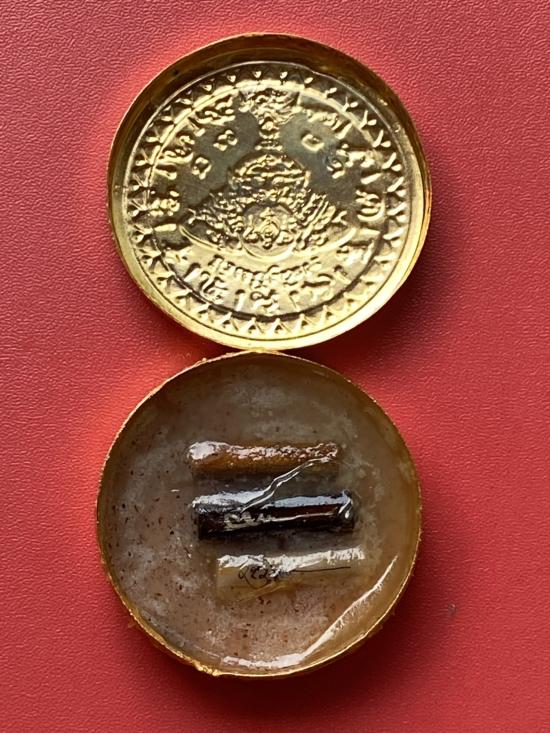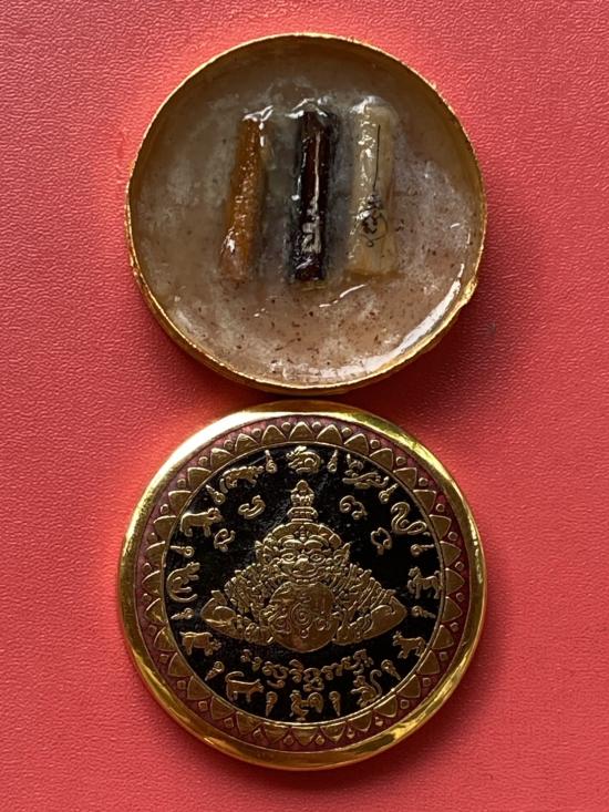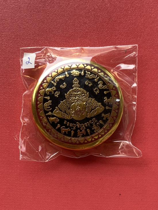 เคาะเดียวแดง สีผึ้งพระราหู รุ่น มงคลจักรวาล เนื้อ โลหะชุบทองลงยาสีดำขอบสีแดง ขนาด 5ซม |