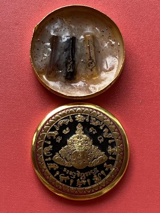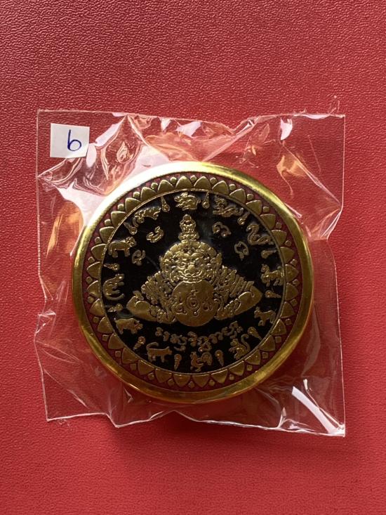 เคาะเดียวแดง สีผึ้งพระราหู รุ่น มงคลจักรวาล เนื้อ โลหะชุบทองลงยาสีดำขอบสีแดง ขนาด 5ซม |