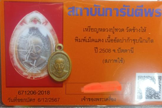 เหรียญหลวงปู่ทวด วัดช้างให้ พิมพ์เม็ดแตง(หน้าผากสามเส้น) เนื้ออัลปาก้า ปี2508 จ.ปัตตานี พร้อมบัตรรับรอง