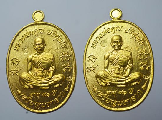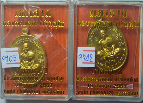เหรียญหลวงพ่อคูณ วัดบ้านไร่ รุ่น มหาลาภ เททอง วาระ 3 ครั้งสุดท้าย ปี 57 เนื้อทองระฆัง 2 เหรียญ เลข 9742+9105