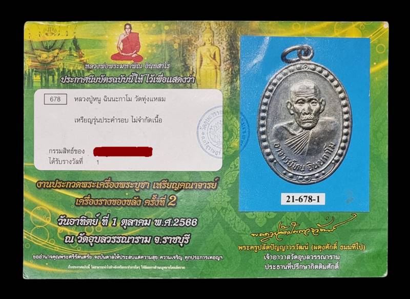 เหรียญประคำรอบ ปี 2525 หลวงปู่หนู วัดทุ่งแหลม จ.ราชบุรี เนื้อเงิน สภาพสวยแชมป์ มีใบรางวัลที่ 1 ติดมาด้วยครับ