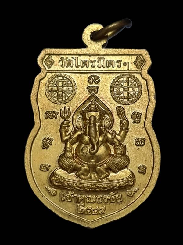 เหรียญหลวงพ่อทองคำ วัดไตรมิตร ปี 2549 ด้านหน้าออกแบบเป็นรูปทรงเสมา ล้อมรอบด้วย พญานาค 2 ข้าง มีราหูอยู่ตรงกลาง เสริมดวงสุดๆ ด้านหลังเป็นพระพิฆเนศ เทพแห่งความสำเร็จ ท่านเจ้าคุณธงชัย วัดไตรมิตร ปลุกเสก |