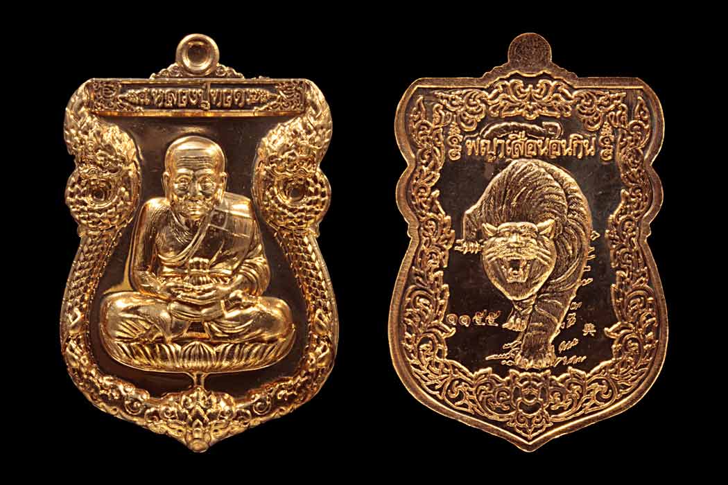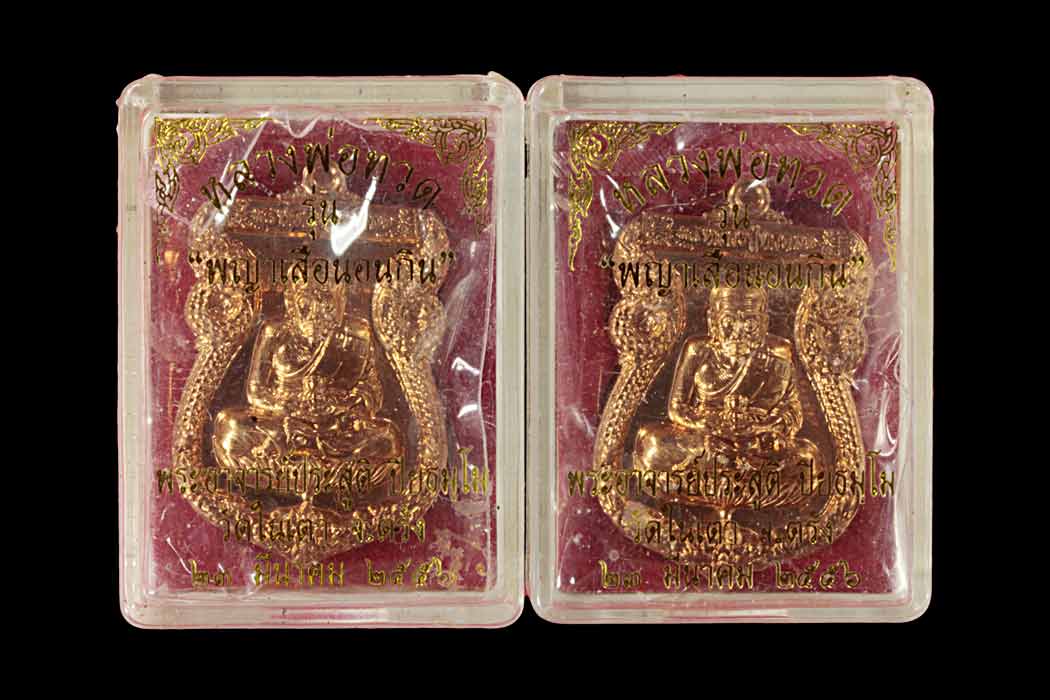 วัดใจ 2 เหรียญ เหรียญหลวงปู่ทวด รุ่นพญาเสือนอนกิน พระอาจารย์ประสูติ วัดในเตา จ.ตรัง เนื้อทองชมพู เลข 2352 กับ 1155 พร้อมกล่อง