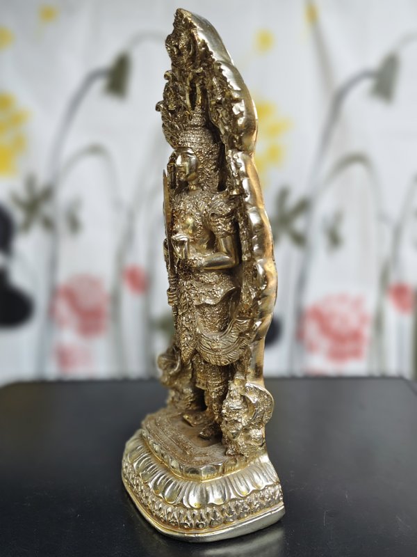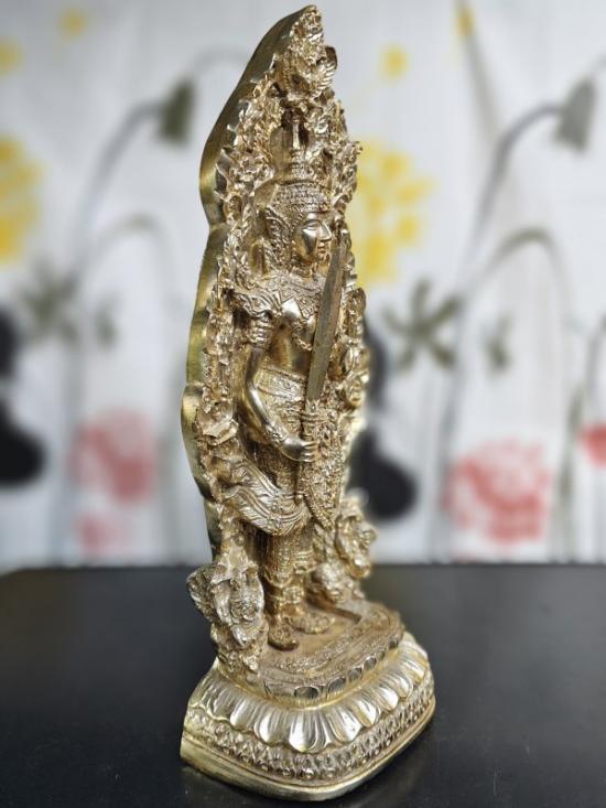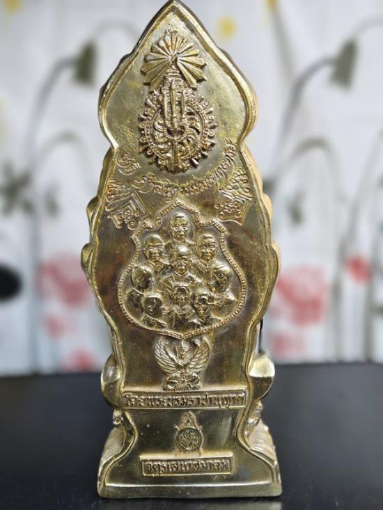 พระสยามเทวาธิราช เนื้อซิลิก้าเคลือบกะไหล่ทอง จัดสร้างโดยจตุรเสนาสมาคม ฐานกว้าง6นิ้ว สูง 16 นิ้ว พระขรรค์ถอดได้ ประมาณปี2525 ด้านหลังเป็น 9 รัชกาล |