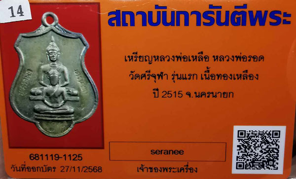 เหรียญหลวงพ่อเหลือ หลวงพ่อรอด วัดศรีจุฬา รุ่นแรก เนื้อทองเหลือง ปี2515 จ.นครนายก + บัตรG-pra สภาพเดิมค่ะ |