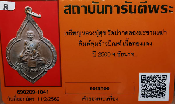 เหรียญหลวงปู่ศุข วัดปากคลองมะขามเฒ่า เนื้อทองแดง ห่วงเดิม ปี2500 จ.ชัยนาท+ บัตรG-pra สภาพเดิมค่ะ |