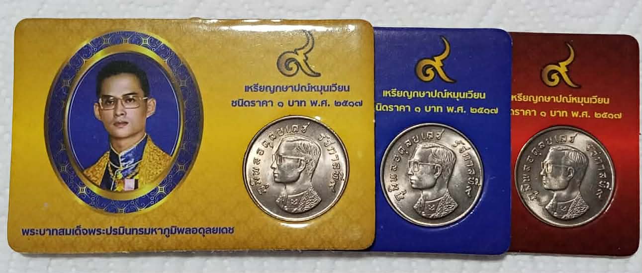 เหรียญ 1 บาท หลังพญาครุฑ เหรียญบาทประสบการณ์ พกติดตัวไว้เป็นมงคล เหรียญสภาพไม่ผ่านการใช้งาน พร้อมการ์ดสีน้ำเงิน,แดง,เหลือง จำนวน 3 เหรียญ