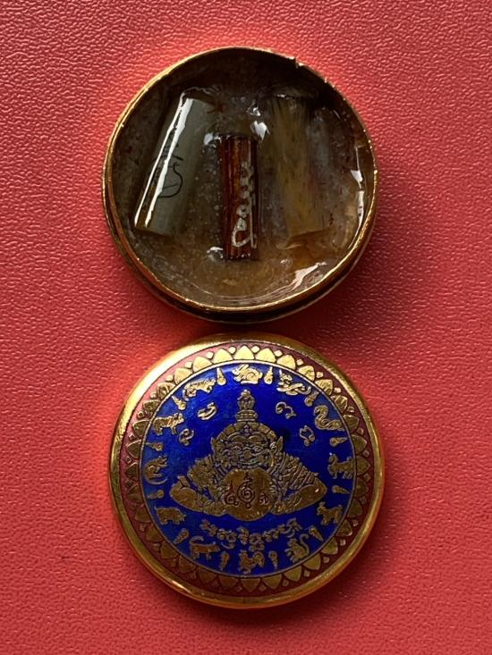 เคาะเดียวแดง สีผึ้งพระราหู รุ่น มงคลจักรวาล เนื้อ โลหะชุบทองลงยาสีน้ำเงิน ขอบสีแดง ขนาด3.2ซม