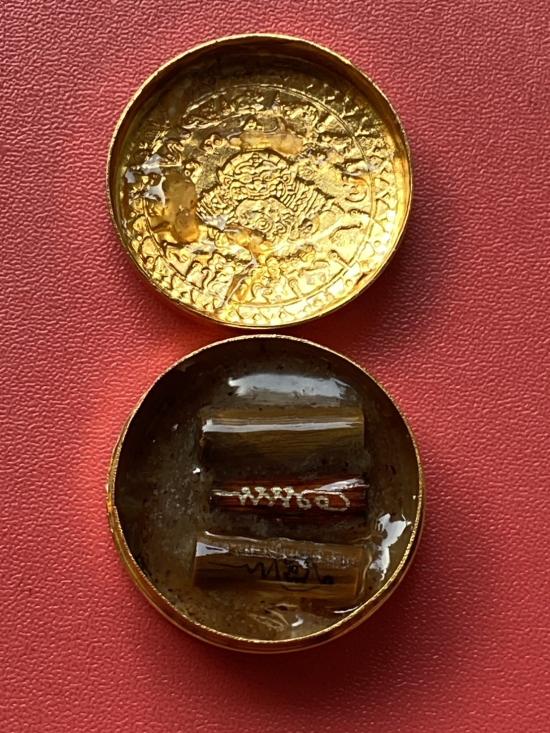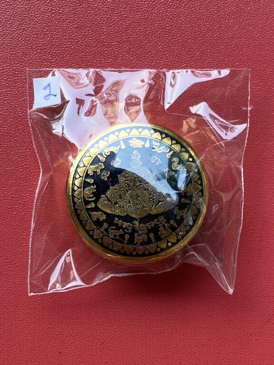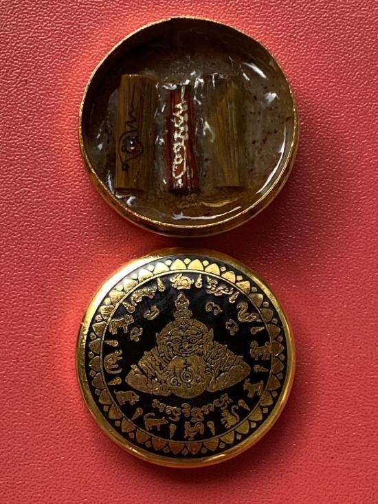 เคาะเดียวแดง สีผึ้งพระราหู รุ่น มงคลจักรวาล เนื้อ โลหะชุบทองลงยาสีดำขอบสีแดง ขนาด3.2ซม