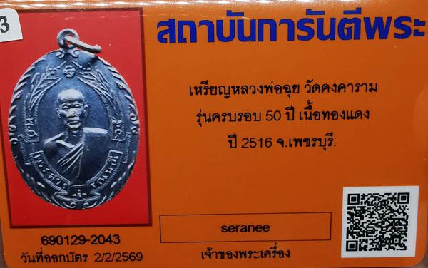 เหรียญหลวงพ่อฉุย วัดคงคาราม เนื้อทองแดง ห่วงเดิม ปี2516 จ.เพชรบุรี + บัตรG-pra สภาพสวยเดิมค่ะ สภาพตามรูปทุกประการค่ะ