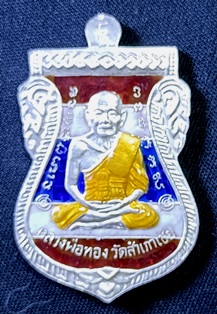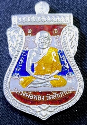หลวงปู่ทวดอาจารย์ทอง เสมาหน้าเลื่อน เนื้อเงินลงยาสีธงชาติ แซยิด93 กล่องเดิม ซีลเดิม หมายเลข 156 มีรอยแตะด้านหลังตรงจมูกหลวงพ่อตามรูป แดงที่ 600.- |