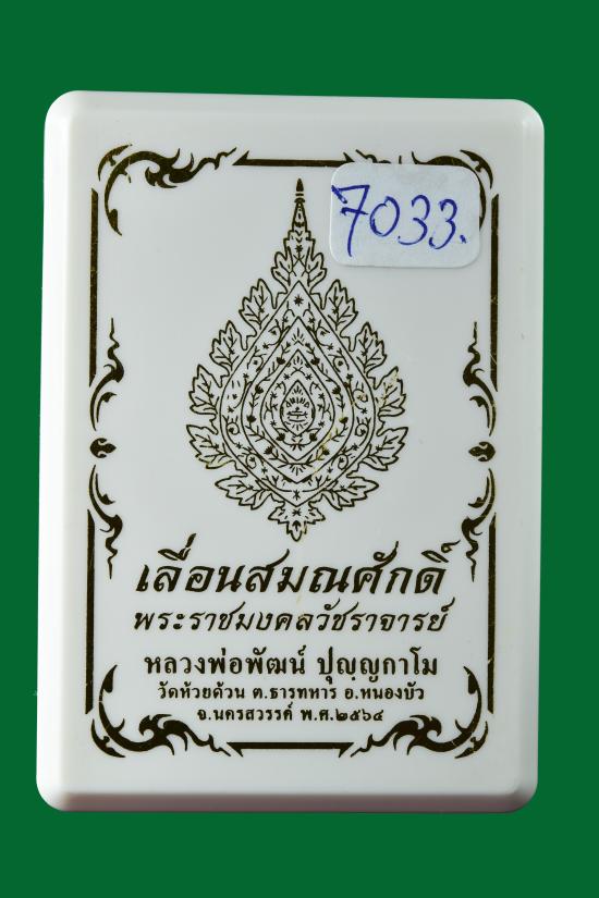 วัดใจ เหรียญหลวงพ่อพัฒน์ วัดห้วยด้วน รุ่นเลื่อนสมณศักดิ์ ปี 2564 เนื้อปีกเครื่องบิน หน้ากากทองทิพย์ หมายเลข ๗๐๓๓ ซีลเดิม กล่องเดิม |