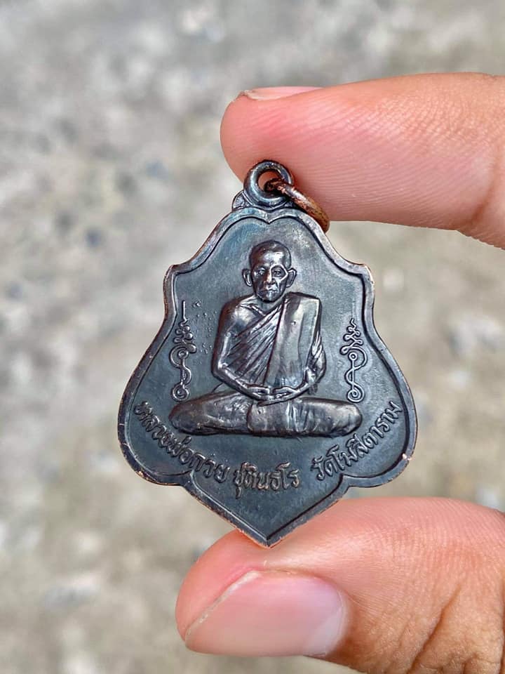 เหรียญหลวงพ่อกวย วัดโฆสิตราม รุ่น3 หลังยันต์ไตรสรณคม (รมดำ) ปี 2521 พร้อมกรอบทอง |