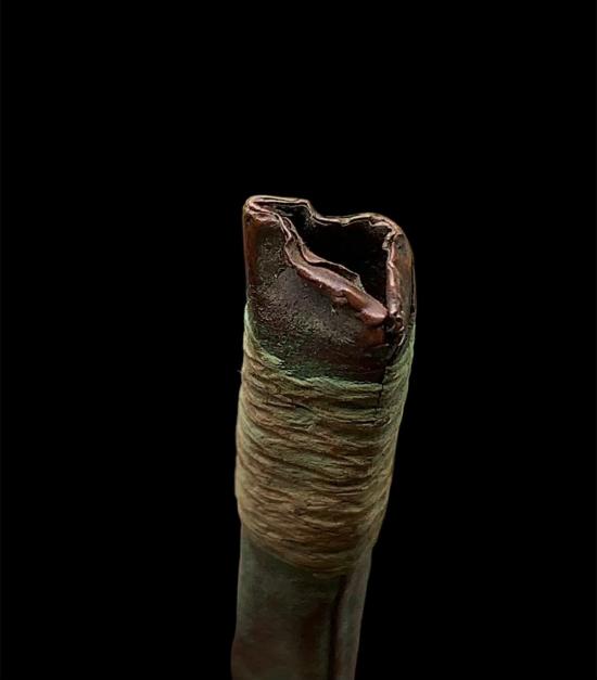 ตระกรุดทองแดงยาวประมาน 4 นิ้ว เก่ามากจนเชือกขาดแห้งเป็นไม้ เนื้อทองแดงเก่าจะออกเป็นสัมฤทธิ์เลยครับ |