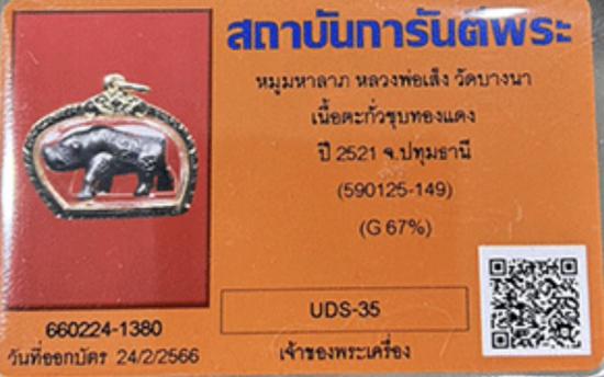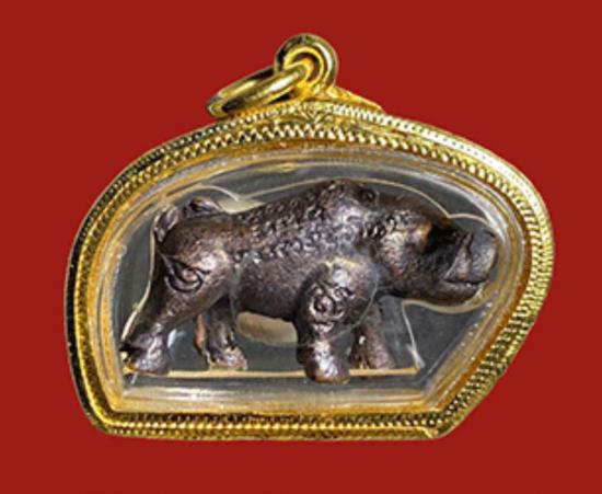หมูมหาลาภ หลวงพ่อเส็ง วัดบางนา เนื้อตะกั่วอาบทองแดง ปี 2521 จังหวัดปทุมธานี เลี่ยมทอง พร้อมบัตรพร้อมบัตรรับรอง