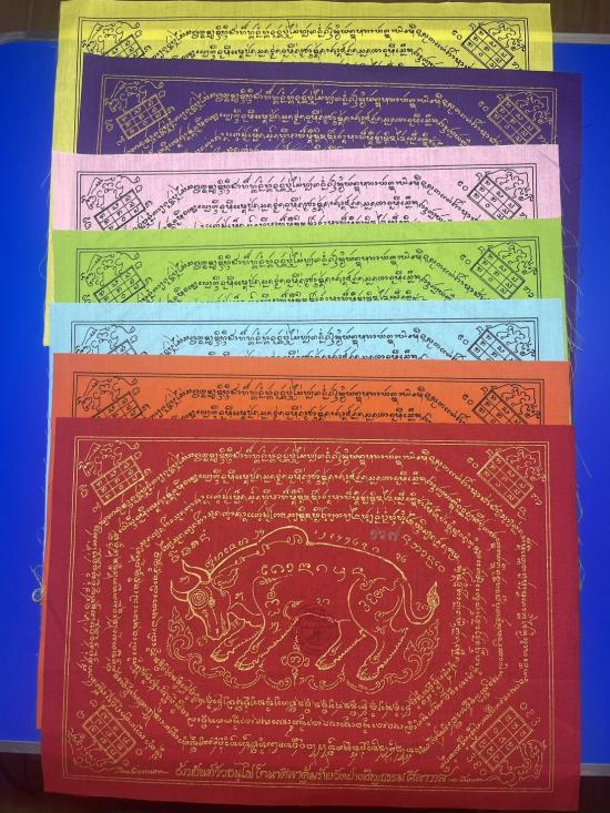 วัวธนู ผ้ายันต์7สี พระอาจารย์พันแสน วัดศิลาวาส วัวธนูเนื้อชนวนพิเศษลงยาดำ-แดง เลข1 ผ้ายันครบ7สีๆละผืน