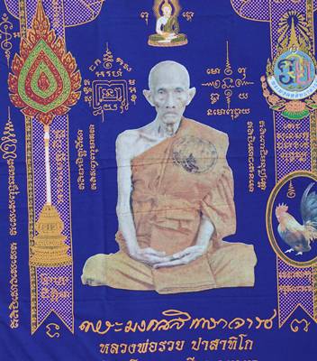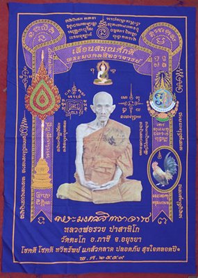 ผ้ายันต์เลื่อนสมณศักดิ์ หลวงพ่อรวย วัดตะโก อยุธยา สีน้ำเงิน ปี 2559 |
