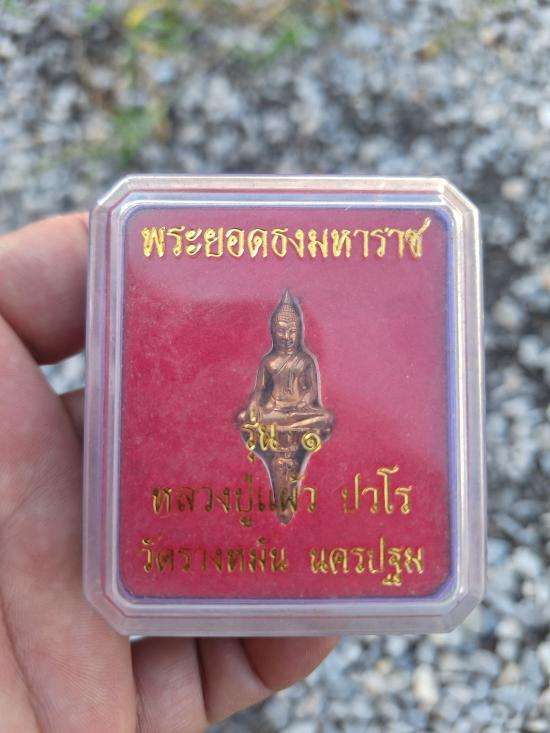 พระยอดธง รุ่น 1 หลวงปู่แผ้ว ปวโร วัดรางหมัน พ.ศ.2556 เนื้อทองแดงตอกโค๊ดกำกับ พร้อมกล่องเดิมจากวัด |